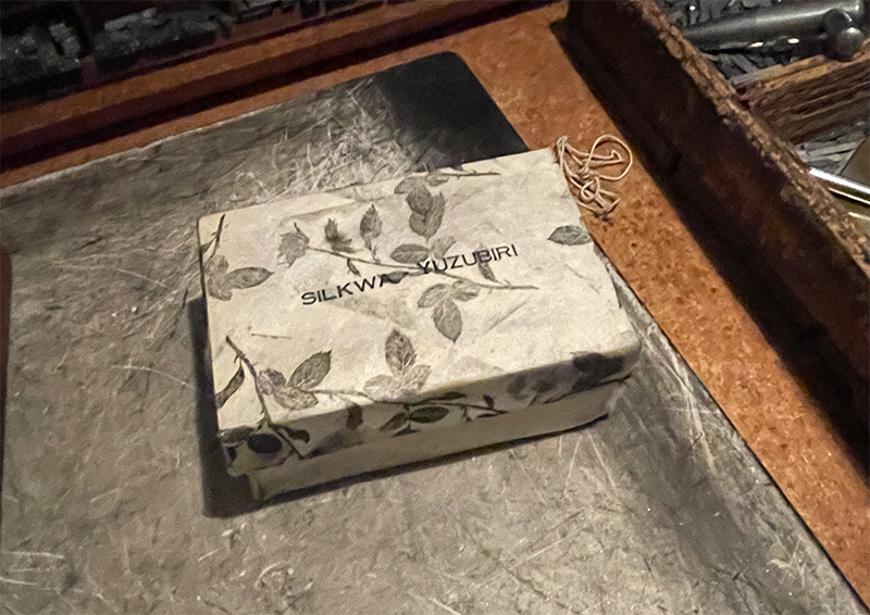しるくわの阿部さんから受け取ったまゆけばで箱を作る作業。A4サイズに作っていただいたまゆけばは厚みが一定でなく、濃淡がどうしても生じる。その濃淡を活かしながら行うが、大体が勘。
