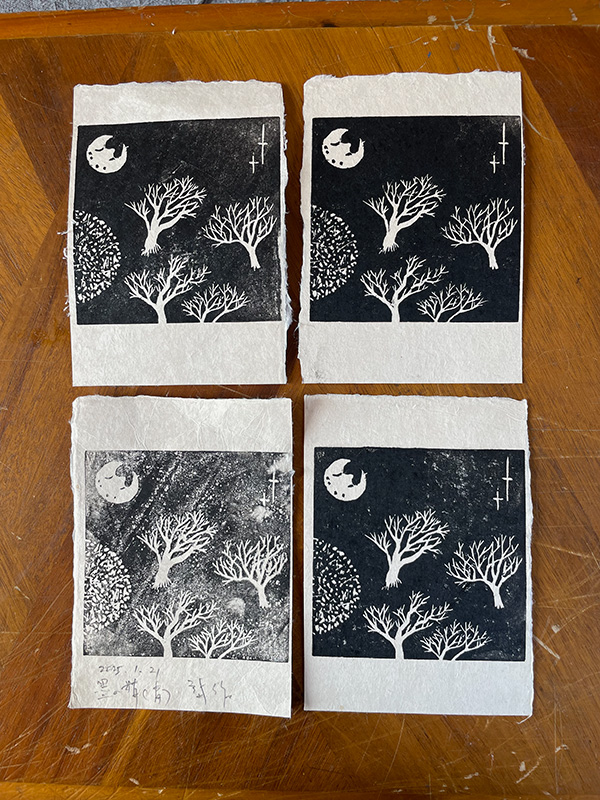 双紙の表紙画の印刷。ほとんど失敗せずに終える。試しに行った墨汁での印刷は失敗するが、失敗したものが雪景色でとてもいい感じだった。