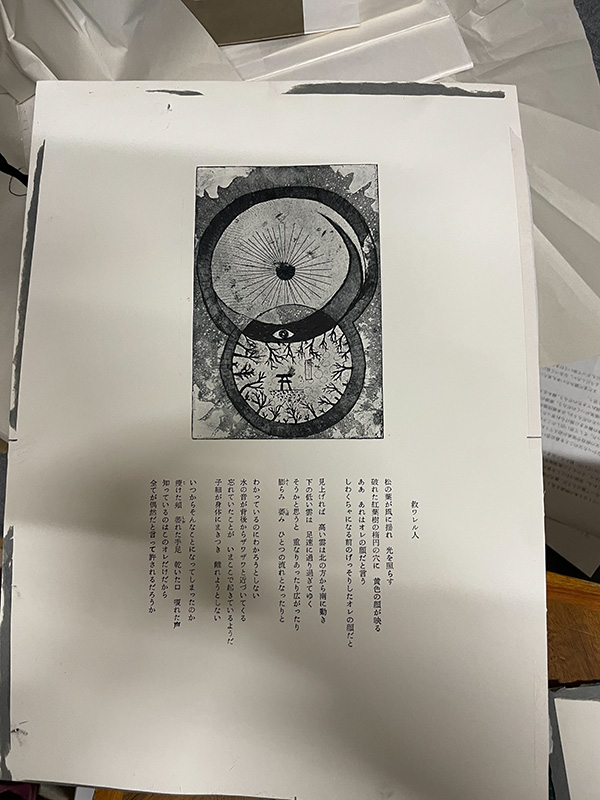 「生マレ変ワルナラ」の印刷。銅版画のシートに印刷位置を特定するための線を鉛筆で引き、水平垂直を間違わないように行う。午後にもう一つの作品「救ワレル人」の印刷。