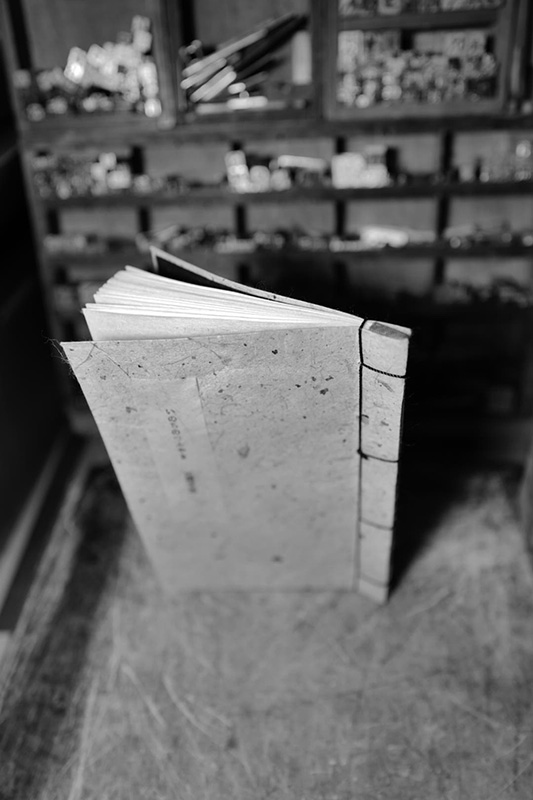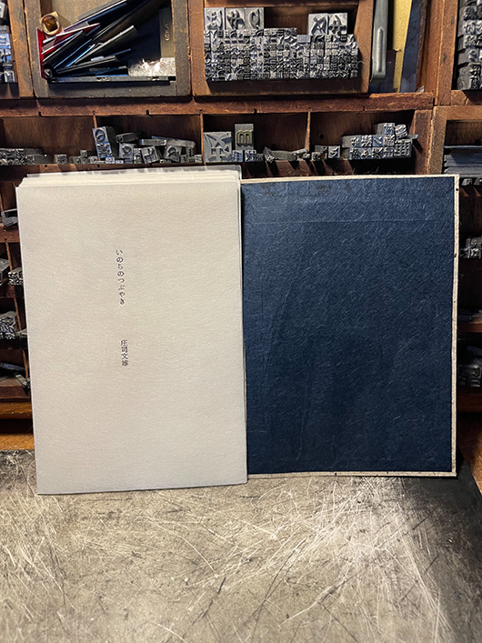 庄司さんから製作依頼があった『つぶやき詩集』のための表紙の試作。鹿敷製紙さんの藍染の和紙を表紙の裏紙にする。