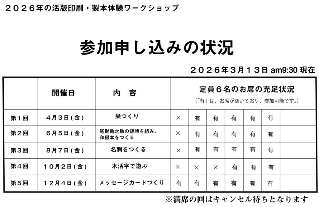 2026年の活版印刷・製本体験ワークショップの申し込み状況及び開催内容