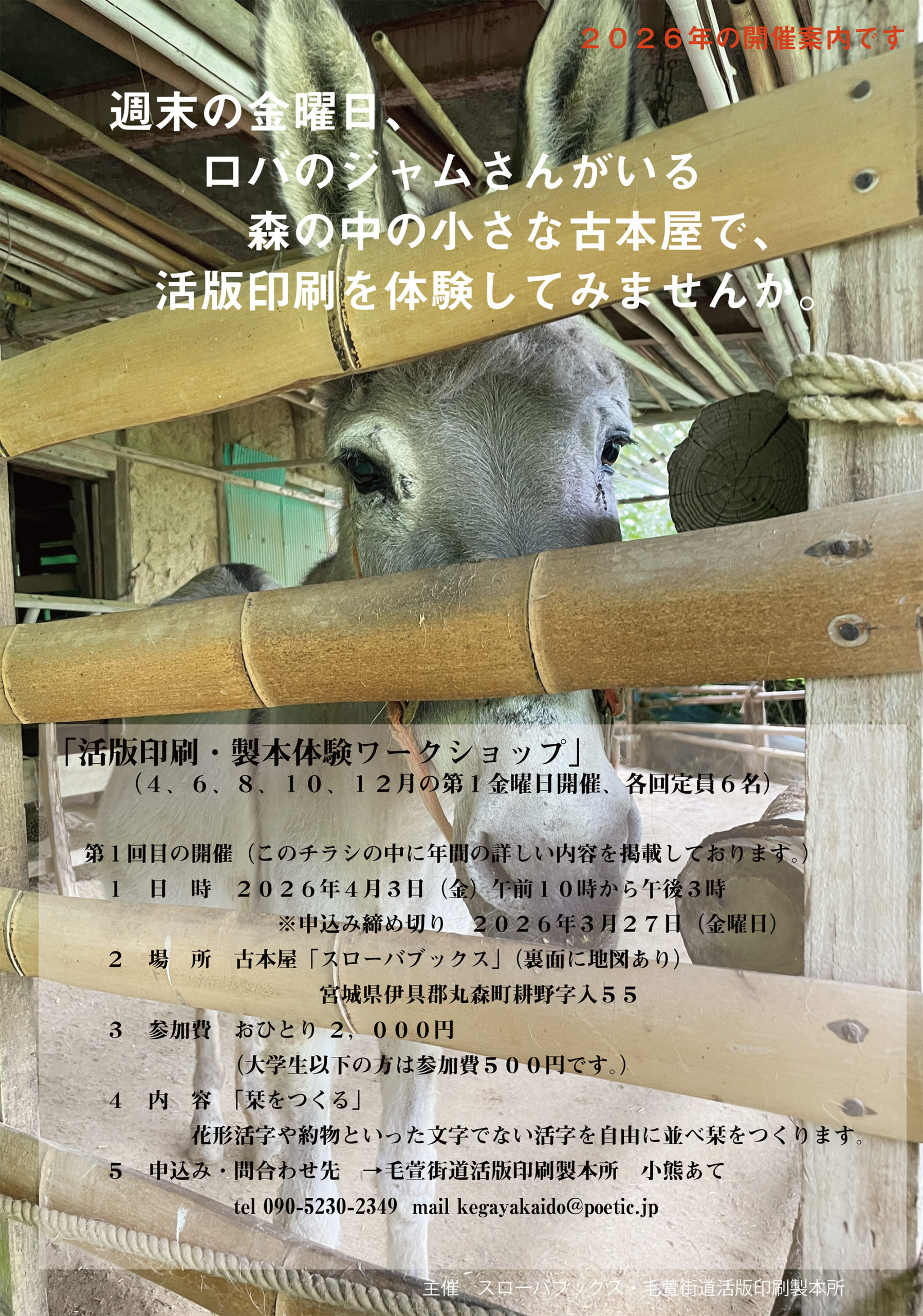 今年(2026年)の活版印刷・製本体験ワークショップの予定を掲載しました。詳しい開催内容及びチラシのダウンロードはこちらのページにお立ち寄りください。申し込み状況も掲載しております。
