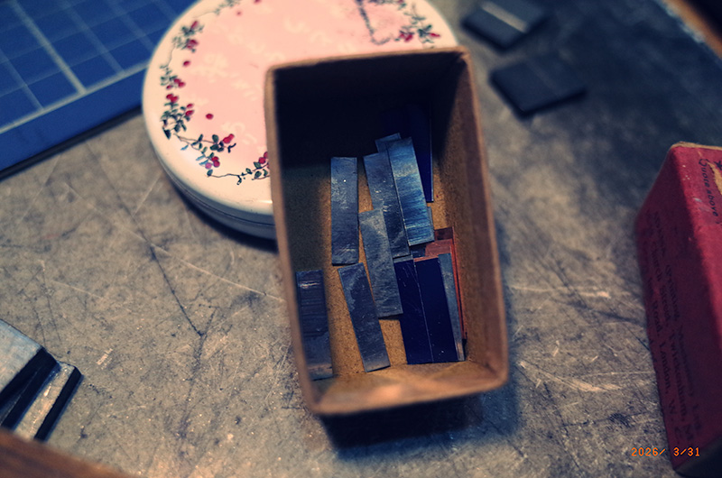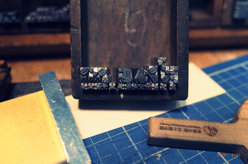 ワークショップの準備を少しずつ行う。栞の寸法に合わせてステッキに敷くご号活字のクワタの枚数を確認し、それに合わせて木インテルを3人分計65枚用意する。そして横の長さが五号で11本なので、115.5ポイントだから、四号活字を並べた時に同じ高さになるための計算を行う。四号活字が8枚と5.5ポイントが必要になる。すると5.5ポイントを何で埋めるかということを考える。金属インテルの在庫を見ると2ポイントの金属インテルがある。2ポイント2枚と1ポイント1枚、それに0.5ポイントのインテルを合わせれば高さが合うので平らになる。どうして四号での計算をしたかといえば、猫の足跡と珈琲豆の活字が四号なので、それを使いたい方が出てくることを想像してみたからだ。一昨年同じワークショップをしたときには使いたいという方が現れなかった。ほっとしたり、残念と思ったり、複雑だった。そういうことで言えば、12ポイントの花形活字を使いたいという人も出てくるかもしれない。12ポイントだと、115.5ポイントに高さを合わせるとなると9枚と7.5ポイントになる。この7.5ポイントが12ポイントのスペースでちょうど合えばいいのだが、そうはなかなかならない。12ポイントの二分スペースが6ポイントだから、それに1.5ポイントを加えれば合う。多分、そんな感じで栞の組版を行うようになるだろうと思う。それと、使う五号の約物が入った棚を整理する。そして、四号全角に合わせて、1ポイントと1ポイントと0.5ポイントの金属インテルを切り出しておく作業を行う。のんびりとそんなことをしていた。