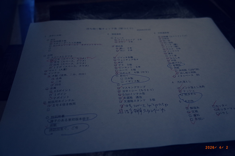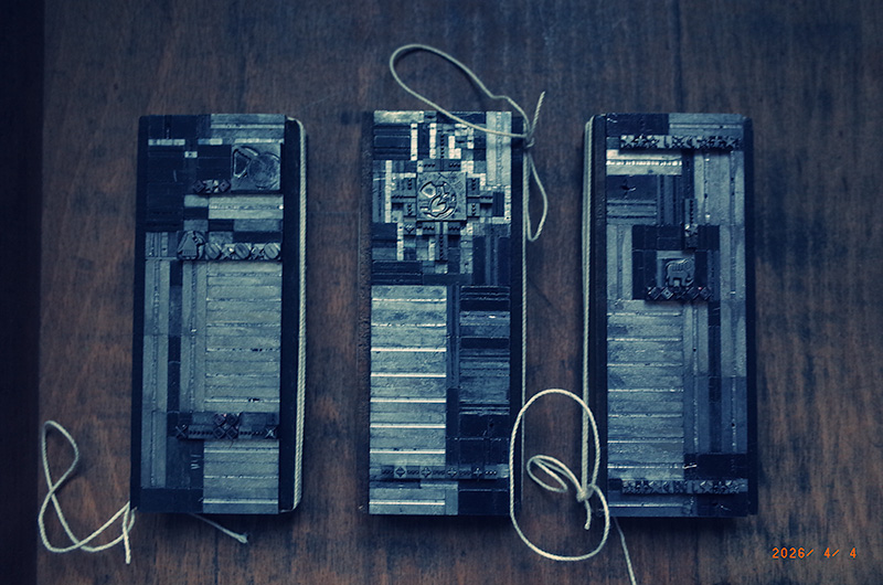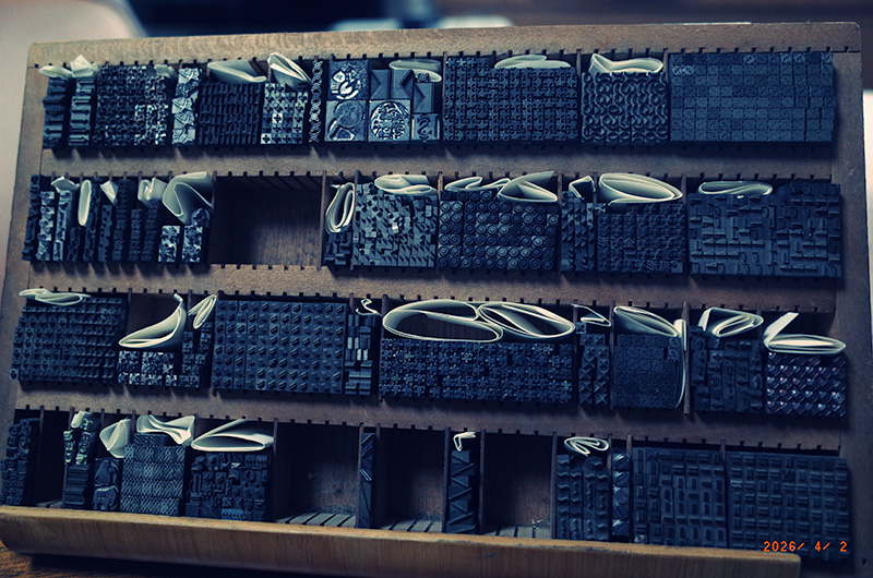 丸森のスローバブックスさんでの活版印刷・製本体験ワークショップ。今年1回目。締切の1週間前で参加申込者が1名だったので、お一人用のメニューを考えていたが、直前に2名の方が参加していただき、3名で行う。お一人二つぐらいの組版が作れるかと思ったけれど、一つを作るのでちょうどよかった。五号で横11文字、縦32文字の空間を最初に提示し、そこに記号や約物、花形活字を詰めた活字だなから気に入った活字を置いてゆくという作業から始める。五号の活字以外に四号や12ポイントなどの活字もあるので、手間暇かかるので、できるだけ五号、五号倍数以外は選ばないようにと声がけをして始めるも、はやりおもしろうそうな活字を見つけるとみんな使いたくなるんだなと思う。それをキャンバスに絵を描くように自由に置いていった。次に空白を埋める作業を行い、次第に合わなくなり小さな空間が生じた箇所が特定されて、それを1ポイントや2ポイントにおインテルを活字の大きさに切って、あるいは紙を鋏で切って埋める。午前で、おおかた墨のインクで印刷をしてみる。午後で、それを元んじ修正を加え、墨で印刷。最後に銀色のインクで濃い紙に印刷をする。意外だったのは、銀色のインクで白い用紙に印刷をしてみたら、とても綺麗だったこと。面白かった。午後4時に終了。ありがとうございました。