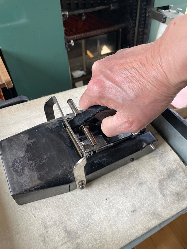 この印刷機を使って、凸版の絵と文字を組み合わせた版を印刷していただきます。印刷のやり方は簡単です。レバーを握ってぎゅっと押せば終わります。