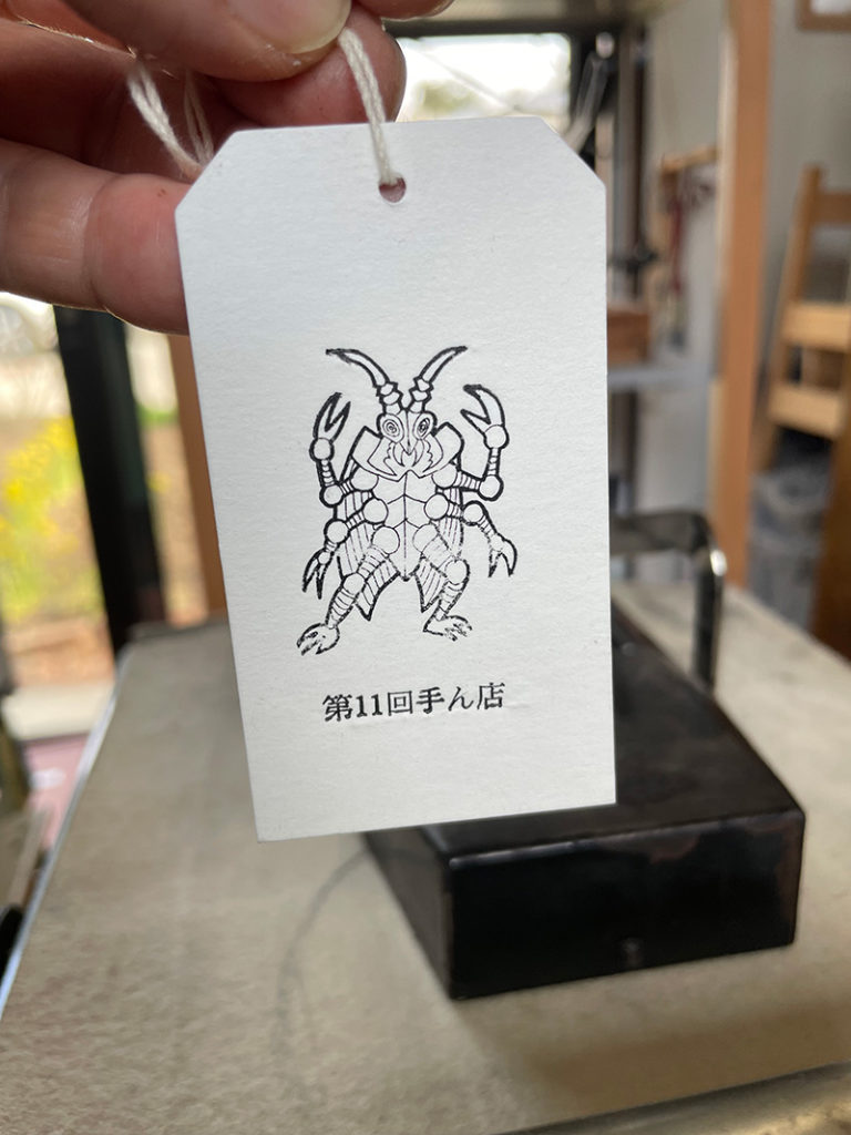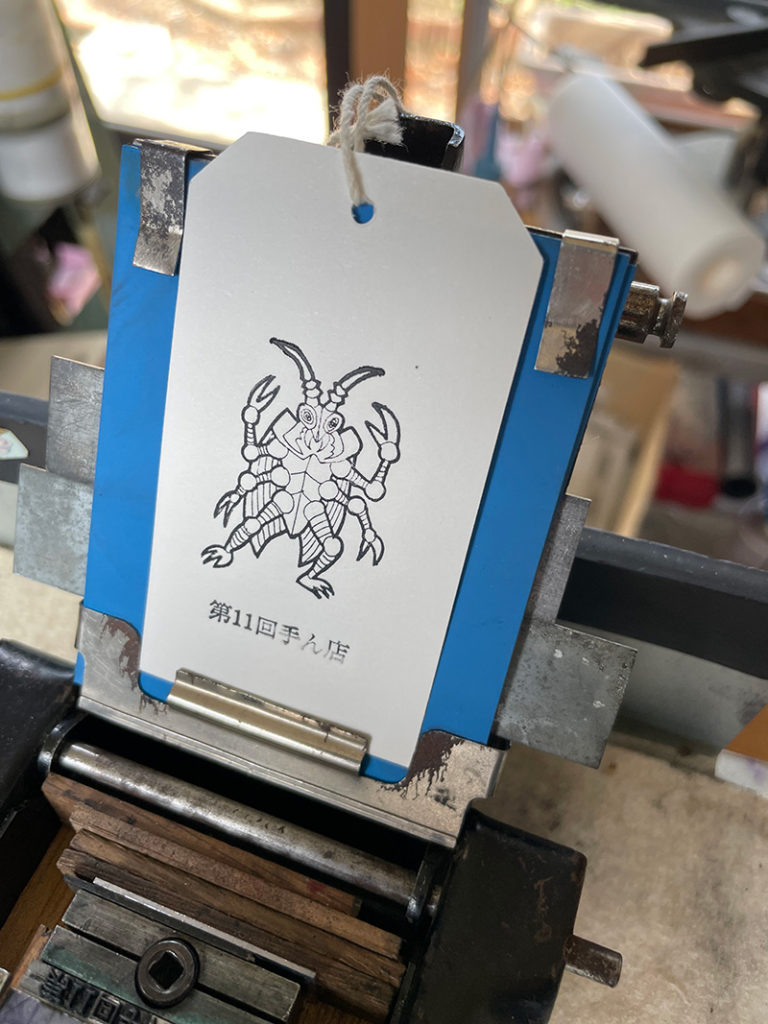 アンドロイド昆虫の絵と「第11回手ん店」という文字を組み合わせた版を小さなタグに印刷をしていただきます。