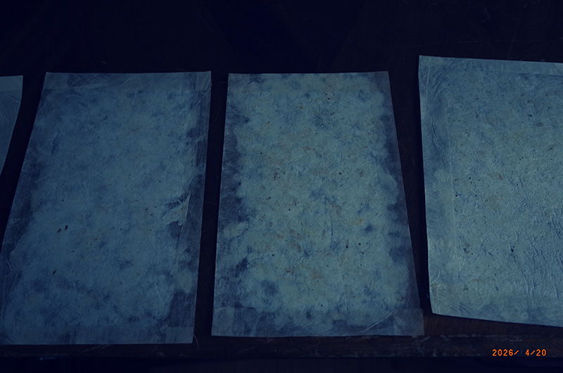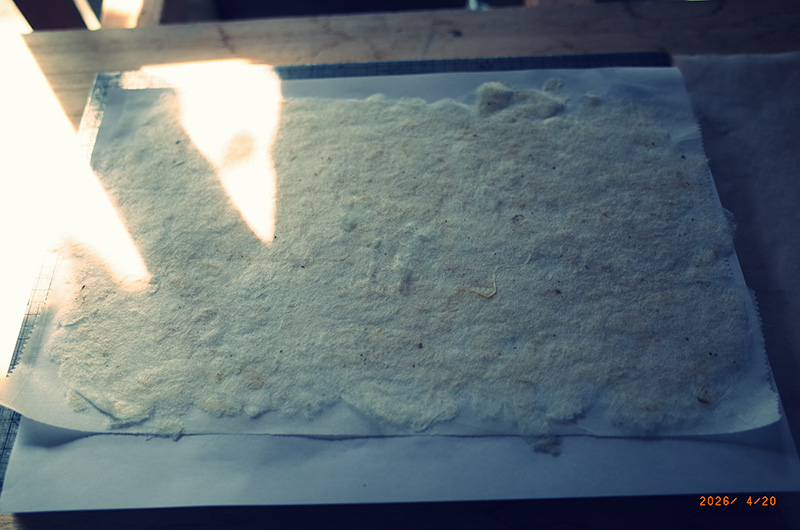 工房に入り、まゆけばペーパーを作る作業。昨日、雁皮の紙で裏打ちしたものがとても気に入ったので、その方法でできる限りの量を作ろうと思う。とにかく、作ったら、その後何を印刷して作るかは、ゆっくりと考えようと思う。縦30センチ、横20センチぐらいの大きさのまゆけばペーパーを作る。最初に、まゆけばをほぐす作業から始める。まゆけばは糸が凝り固まった部分があちらこちらにあり、それをできる限り手でほぐす。そして大きさに合わせて置いてゆく。薄い部分に重ねて置いてゆき厚みをできるだけ一定にする。この時点では綿飴みたいな、蜘蛛みたいな状態なので、厚みが一定になるとはとても思えない。そこで、一度霧吹きをかけ、クッキングペーパーで挟み、銅版画のプレス機で圧縮する。するとある程度薄いところが見えてくる。そこにサイドほぐしたまゆけばを置いてゆく、そして再度霧吹きをかけ、銅版画のプレス機で圧縮する。本当はこの作業を丁寧に何度も繰り返して行うことで紙のような均一の厚みを持ったまゆケバペーパーができそうだが、それを行うのは今後として、今はとりあえずまゆけばペーパーを作ることを優先する。そして、アイロンを掛け、まゆけばを平たく固める。すぐに吸い取り紙に挟み、重しの下で寝かす。これれを7回行う。つまり、7枚のまゆけばペーパーが完成する。午後、まゆけばぺーぺーの様子を時々見る。そして空気に触れさせ、水分を取り除く。午後3時ごろには、しばらく机の上に広げておいた。するとかなりそりかえっている。触ると水分がかなり抜けている。それからまたまゆけばだけを7枚重ね重しの下に置いておく。これを明日の朝まで行う。